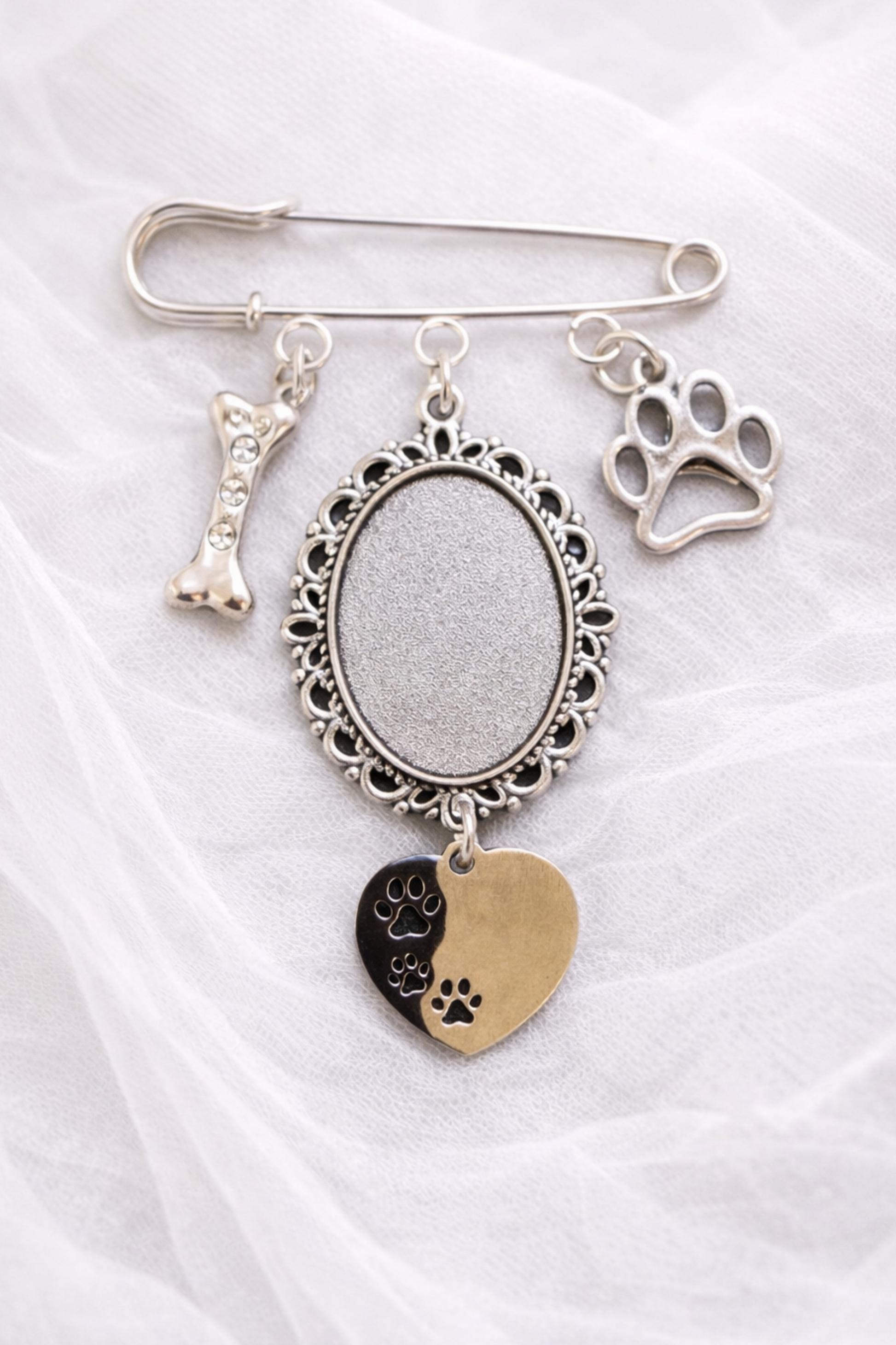 Incluye dije de hueso y huellita en plata de ley S925, corazón personalizable con el nombre de tu mascota.
