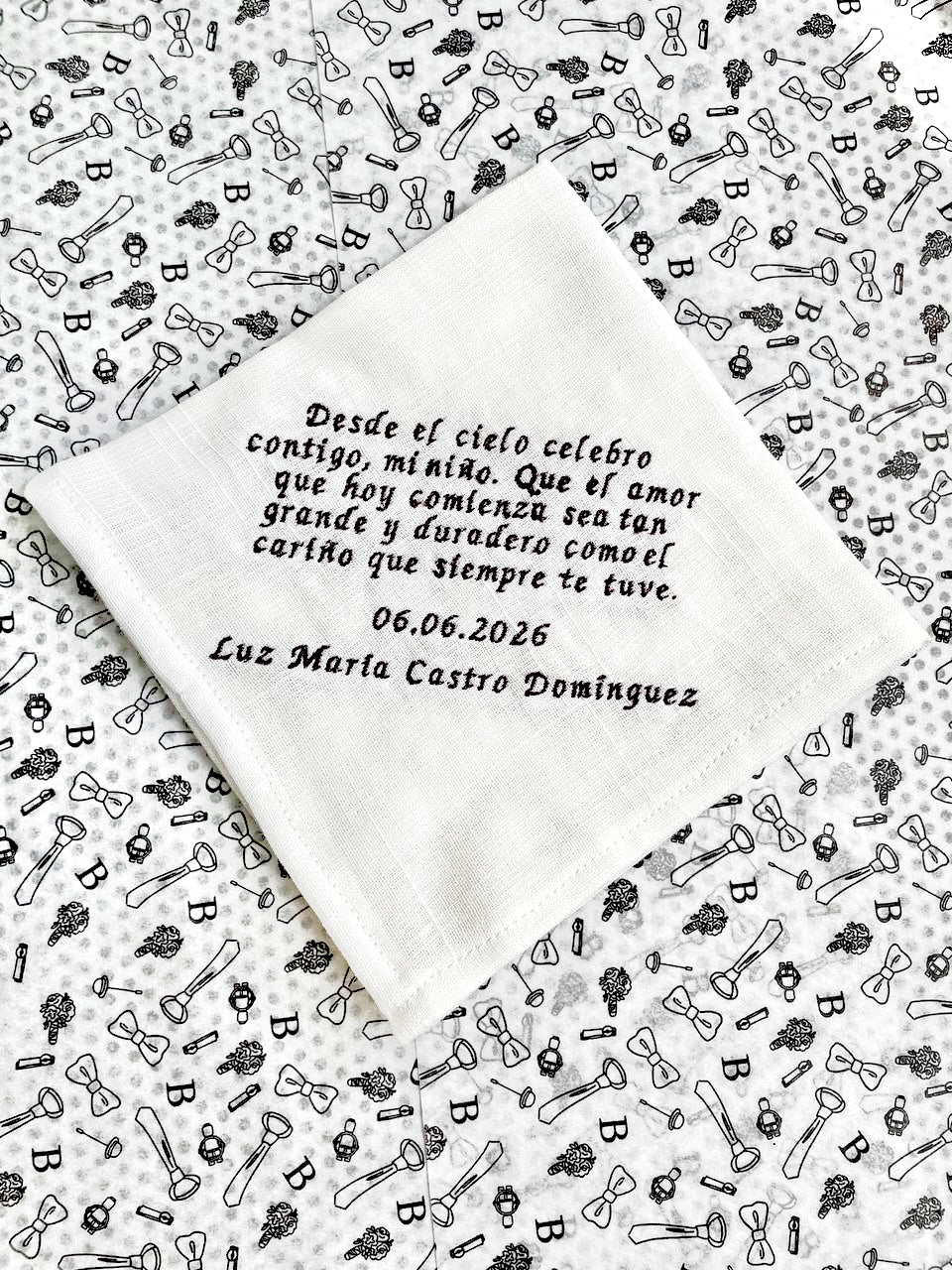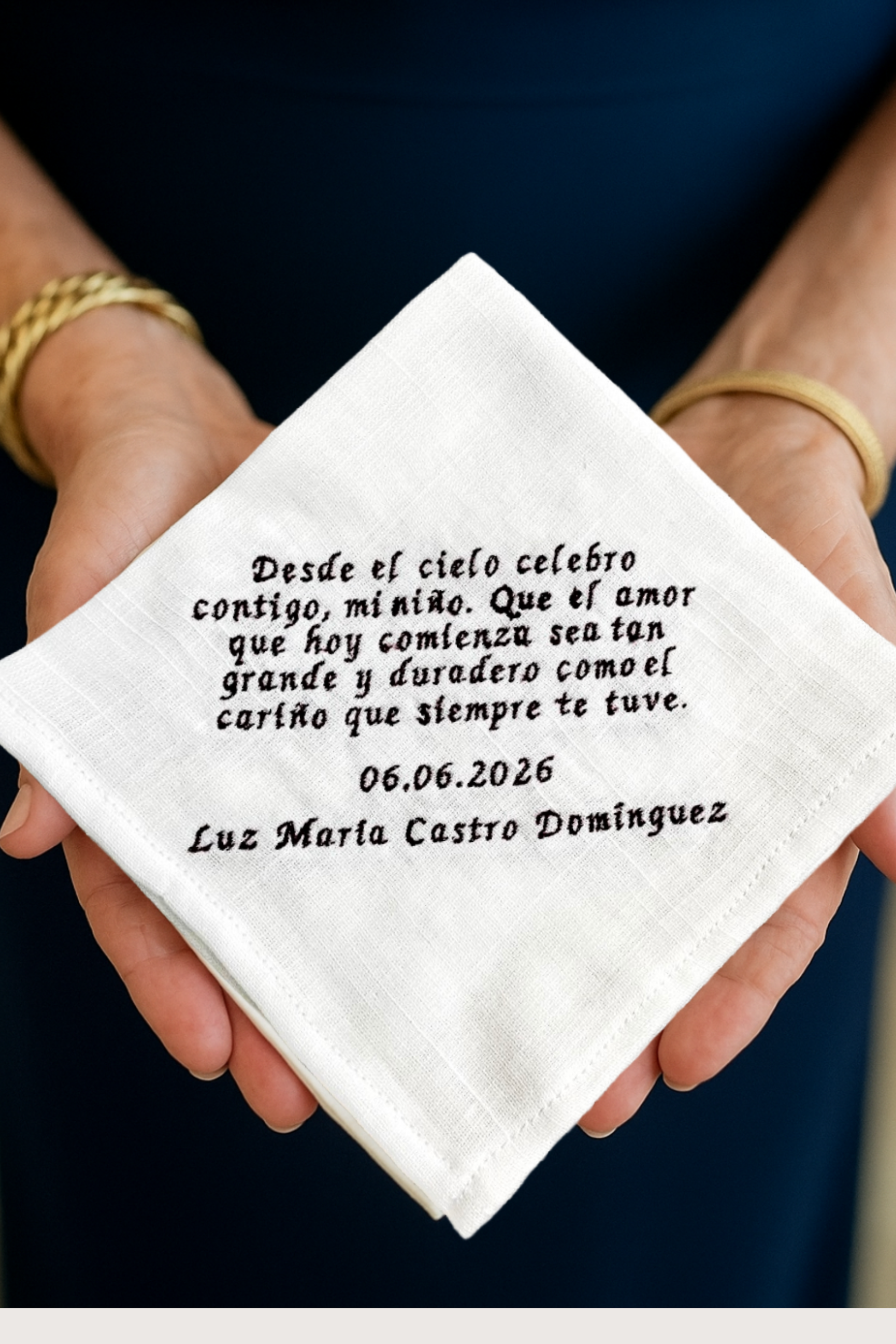 Nuestros pañuelos de lino bordados son el detalle más emotivo para mamá, papá o esos familiares que viven contigo cada instante del gran día.